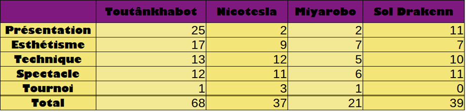 Les jurys ont chacun 10 points à répartir entre les bots dans différentes catégorie : Présentation, Esthétique, Technique, Spectacle. S'ajoute à cela les points remportés lors des combats.
