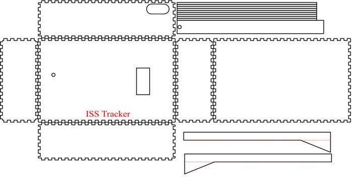 - Tout d’abord, afin de gagner du temps il est conseiller de lancer la découpe de la plaque de bois afin d’obtenir les différentes parties constituant la boîte ainsi que le mat. Cependant, la face supérieur (là où il est inscrit « ISS Tracker ») possède sur sa partie droite, un trou sous la forme d’un rectangle. Avant de lancer la découpe laser de ce plan, il faut s'assurer que l'un de vos servomoteur loge dans ce trou avec, sur la longueur, un millimètre de marge pour l'installation.