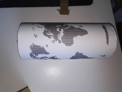 - Pour réaliser le cylindre nous avons avant tout découper deux (ou plus) disque de carton de 88mm de diamètre. Pour consolider le tout nous avons intégré quelques tiges de bois afin de réaliser la structure du cylindre. A chaque étage nous avons collé chaque tige à chaque bout de carton puis nous avons coller le planisphère en papier sur cette structure (pour cette application, un simple tube de colle blanche suffit). Pour finaliser ce cylindre il faut simplement mettre du scotch pour fixer ensemble les deux extrémités du planisphère.