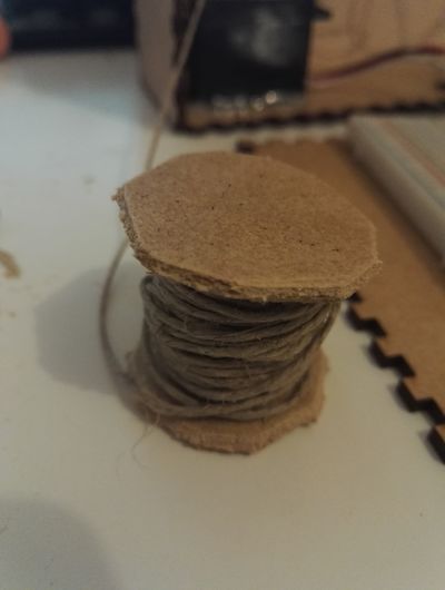 - Pour réaliser la bobine servant à faire monter et descendre l'ISS, nous avons simplement utilisé un demi bouchon de liège et deux disque de carton avec un diamètre légèrement plus large que le diamètre du bouchon (je dis légèrement car ces deux disques doivent pouvoir être contenus dans le socle)