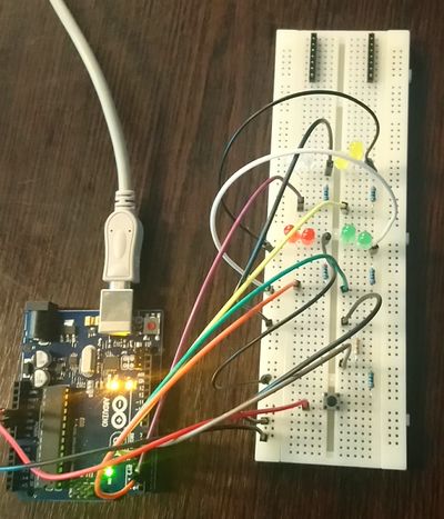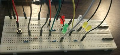 Pour cette étape, nous avons besoin de leds, de câbles (mâle-mâle, mâle-femelle), de la carte arduino, de la plaque labdec d'un ordinateurs avec le logiciel arduino, d'un bouton poussoir, de résistances (valeurs plutôt faible, quelque 100Ω).