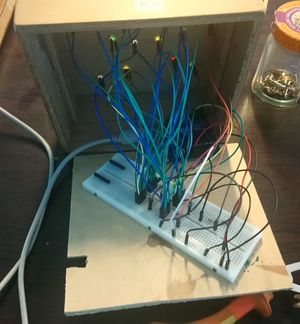 Fixez la carte arduino et la labdec sur la plaque qui referme la boîte, avant de refermer, vérifier qu'il est possible d'accéder à la carte arduino avec le câble pour changer de programme si on le souhait. Brancher la pile sur la carte grâce à l'adaptateur. Refermer la boîte.