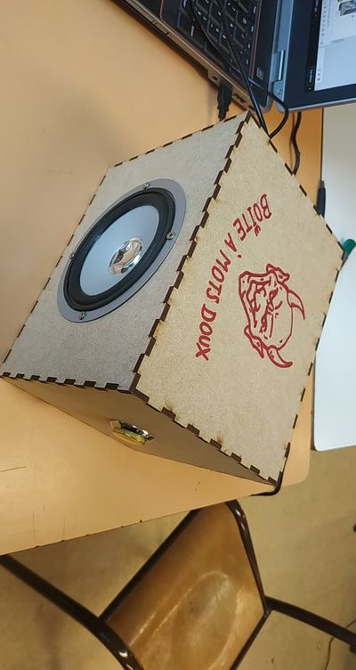 La boite à mots doux est une boite possédant un haut-parleur et un bouton poussoir pour pouvoir changer de piste. Dans la boite il y a un Arduino et un lecteur MP3.
