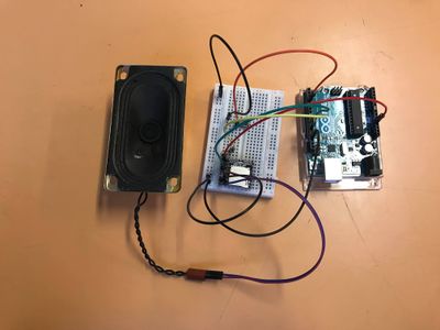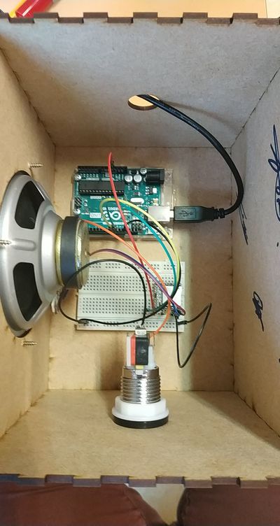 Nous avons fixé l'Arduino, et la plaque labdec au fond de la boite, nous avons soudé les câbles au bouton poussoir ainsi qu'au haut-parleur et visser ce dernier.
