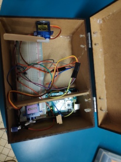 Concrètement, lorsque l'utilisateur met l'interrupteur sur "ON", un servomoteur va lever le capot de la boîte. Ensuite, l'autre servomoteur va tourner et son bras (en forme de U) va atteindre l'interrupteur pour le désactiver. Le bras qui a désactivé l'interrupteur rentre dans la boîte puis l'autre servomoteur tourne dans le sens inverse ce qui implique la fermeture de la boîte.