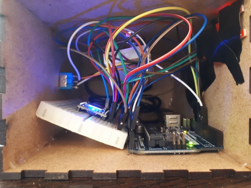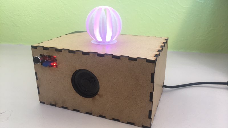 Assemblez tout dans la boite, faite passer la LED dans le panneau du dessus, placer correctement le micro et le haut-parleur dans les orifices prévus à cet effet, et assembler l'interrupteur sur le panneau arrière. Pensez à faire sortir le câble d'alimentation de l'Arduino par son trou, vous pourrez ainsi le brancher à un ordinateur, sur secteur avec un transformateur, ou une batterie externe. Pensez à ne pas dépasser les 5V d'alimentation au cas où vous n'êtes pas branché sur ordinateur.