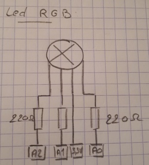 Commencer d'abord par Brancher la LED, en oublier pas de protéger chacune de ses pin avec les résistances de 220 Ω. Sans ces résistances la LED risque de claquer. La LED est branché sur les ports analogiques de l'Arduino pour pouvoir moduler le courant qu'on lui envoie, afin de pouvoir la faire varier de couleur.