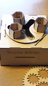 C'est un manège à tasse en bois mais avec des bières. Elles tournent avec des engrenages entrainés par un moteur.
