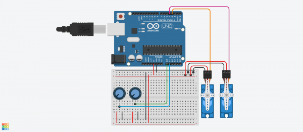 Deux servo-moteurs contrôlent les axes X et Y de la platforme. Les mouvements sont réalisés par 2 potentiomètres.