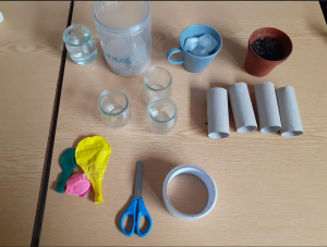 Verser l'eau salée dans un petit pot en verre dont on aura caché le fond et les côtés avec du scotch. Faire de même pour les glaçons dans un autre pot. Découper deux rouleaux de papier toilette de sorte à ce qu'ils rentrent dans les pots en verre, en recouvrant le fond avec du scotch pour que le contenu ne se déverse pas. Y verser dans l'un le sable, et dans l'autre la terre préalablement un peu humidifiée.