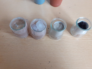 Nous voilà donc avec 4 pots représentant chacun un écosystème différent ; l'océan (pot d'eau salée), le milieu aride/désertique (pot avec le sable), le milieu tempéré ou tropical (pot avec la terre), et le milieu arctique (pot avec les glaçons).