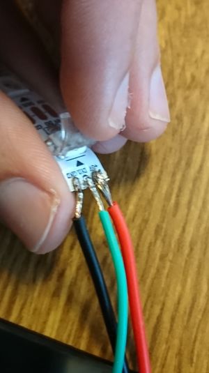 Il faut retirer la protection plastique pour pouvoir accès à la zone de soudure. Nous avons donc souder un fil rouge sur l'alimentation 5V, un vert sur la patte DIN, et un fil noir pour la masse (GND : ground). Prendre soins de se protéger des vapeurs dégagées par l'étain lors de la soudure. Il faut ensuite mettre du ruban isolant pour protéger cette zone. Nous n'en avions pas.