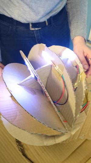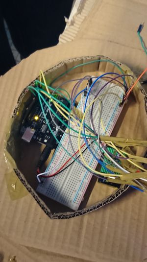 Nous avons ensuite mis une boite en dessous de notre lune pour câcher tout le câblage. Nous avons mis le code sur notre carte Arduino, puis nous l'avons alimenter par pile.