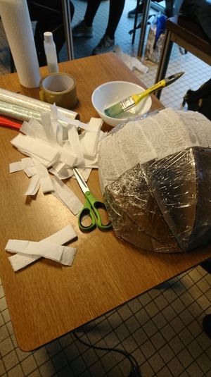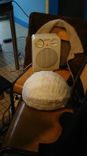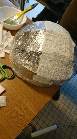 Pour frabriquer la lune nous avons décidé d'utiliser notre socle en tant que moule. Nous l'avons donc recouvert de cellophane, puis nous avons étalé sur la surface de la colle à papier cléopatre, sur laquelle nous avons ensuite disposé des lambeaux de papier essuis-tout. Nous l'avons fait séché, puis nous avons recouvert la première couche par une seconde. Et ainsi de suite, nous avons fait d'autre couche une fois la précédente séchée, et ceci jusqu'à obtenir une surface suffisament épaisse.