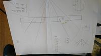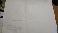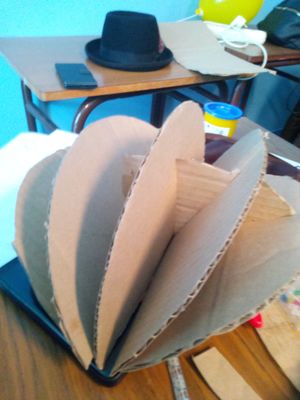 Avant tout nous avons découpé un cercle de 15 cm de rayon dans du carton,puis 6 demi-cercles de 15 cm de rayon. Par la suite nous avons coupé dans l'un des demi-cercles 5 encoches de 10 cm de long aux angles suivants 30°, 60°, 90°, 120° et 150°. Nous avons ensuite inséré les 5 autres demi cercles dans les différentes encoches de façon à former une demi-sphère. Puis, après avoir planté des piques en bois dans le demi-cercle à encoches, nous avons pu le fixer au cercle complet sur le quel la demi-sphère se pose. A la fin nous avons obtenu quelque chose de semblable à ceci :