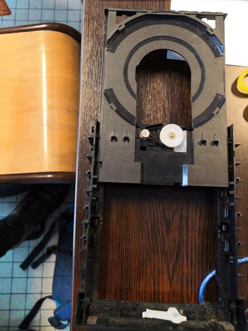 Comme nous avons utilisé des lecteurs CD, nous avons dû les bloquer avant qu'ils n'arrivent en butée. En effet, un mécanisme faisait qu'il ne pouvaient pas revenir directement en arrière et l'énergie fournie par la carte arduino n'était pas assez puissante pour gérer cela. Nous avons donc fixé un bout de bois sur chacun de lecteurs pour que cette action ne se réalise plus.