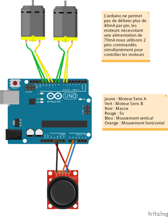 Connecter les moteurs à la carte arduino par des fils. Cette dernière va donner les ordres aux moteurs selon les informations qu'elle va recueillir à partir du joystick.