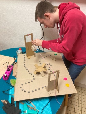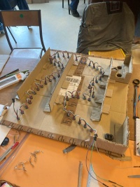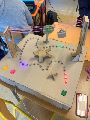 Pour la fin de la matinée, tous les décors étaient finis et le code était fonctionnel. Nous avons monté nos construction au début de l'après-midi et afin d'être prés pour la présentation de notre travail. L'une des partie les plus dure fut le rangement des câbles au sein de la maquette. En effet, pour obtenir un rendu propre, aucun éléments technique ne devaient être apparent.
