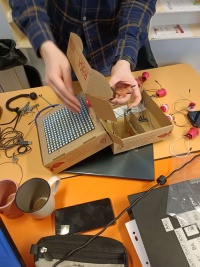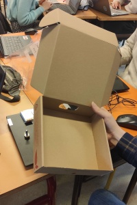Pour commencer on a fabriqué un prototype de la boite en partant d'un carton vide, qui contiendra les circuits internes pour avoir une idée de à quoi ressemblera le projet final: