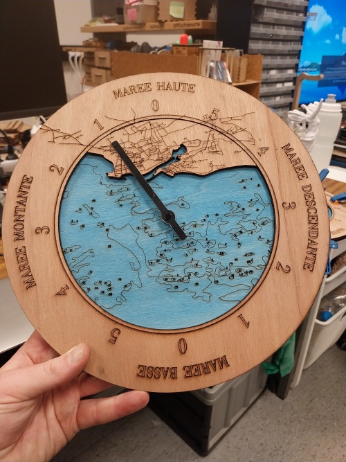 Voici les fichiers d'usinag pour la grande découpeuse laser de l'UBO Open Factory (24 novembre 2024) Fichier:HorlogeAMareeGcode.zip