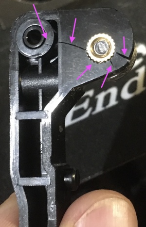 - - L'extrudeur des Ender 3 est en plastique, il arrive à l'usage qu'il se détériore sans qu'on puisse le voir (cf photos), dans ce cas il faut le changer pour une version métallique (environ 10€).