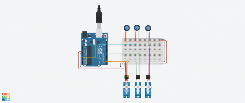 Câblage des servos moteurs et des potentiomètres suivant le schéma de câblage