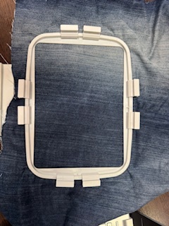 Lever le pied presseur situé à l’arrière de la machine, ce qui lèvera l’aiguille et permettra de placer le tissu dans le tambour sur la zone de travail. Afin de coller correctement le cadre au support, selectionner ok : le bras viendra se placer, puis juxtaposer les deux encoches aux ronds de métal, soulever la palette noire et pousser.