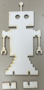 * Formes de robot en bois x1 + Pied de robot x2 * Carte Arduino (avec le code préchargé dessus) + Breadboard x1 * Cables Dupont M-M x4 & M-F x4 * Batteries portable x1 * Cables d'alimentation x1 * LED x2 * Connecteurs WAGO x2