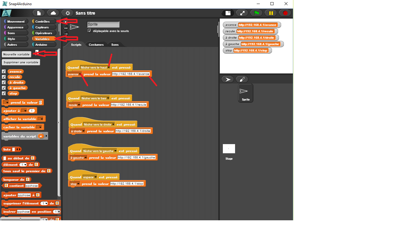 • Créer 5 nouvelles variables : avance, recule, à droite, à gauche, stop.