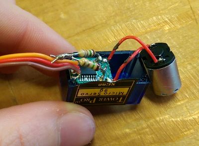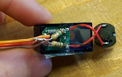 Pour cela, il faut savoir que le potentiomètre du servo fasse 5kohms. Nous allons souder aux bornes du potentiomètre deux résistance de 2,2kohms.