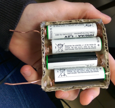 Vous constaterez que les piles une fois insérées ont beaucoup de place, c’est parce que l’on va ajouter les connexions permettant de faire circuler le courant afin d’obtenir quelque chose comme ceci :