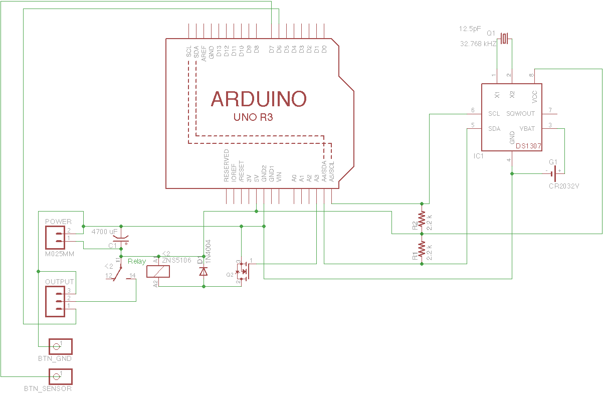 Le boîtier de contrôle sert à gérer le ruban à LEDs. Il comprend l’Arduino Uno et le shield Ethernet, et il est connecté au ruban par le câble de contrôle. En plus de l’horloge, le circuit comprend un relai qui sert à couper complètement l’alimentation du ruban à LEDs quand il n’est pas utilisé. Ceci permet de consommer moins et de ne pas user le ruban inutilement. Comme le relai a besoin pour fonctionner d’un courant plus important que ce qu’un PIN de l’Arduino peut fournir, il est contrôlé par l’intermédiaire d’un transistor.