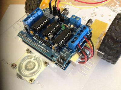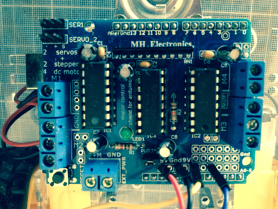 Vous remarquerez que j’ai protégé l’arduino avec amour par un petit tapis de mousse alvéolé :) Pour le câblage des moteurs, j’ai laissé le hasard œuvrer. Une éventuelle inversion de la polarité dans les branchements peut-être résolue dans la partie programmation du projet. Il y a deux petites soudures à faire sur chaque moteur, un fil rouge et un fil noir. Je conseille d’étamer l’extrémité de tous les câbles avant de souder ou de visser dans les connecteurs du shield.