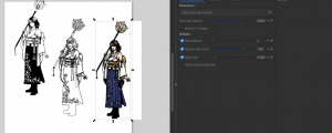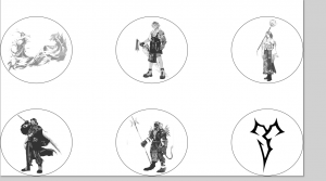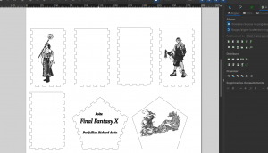 Ensuite, on va ouvrir une nouvelle page sur inkscape pour importer des dessins qui serviront à la gravure sur les cotés de la boite. J'ai pris personnellement des dessin trouvé sur Internet issu de l'univers de "Final Fantasy 10" mais cela peut venir de n'importe quoi d'autre c'est au choix. Une fois que les dessins sont importé, il faut les vectorisé. Ci-dessous une image de divers dessin qui j'ai pris et que j'ai vectorisé pour tester (tout les dessins ne seront pas utilisé).