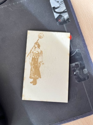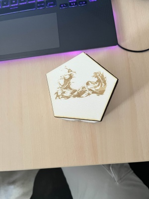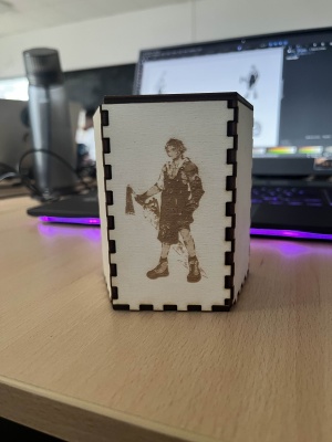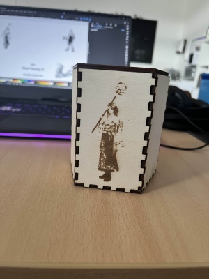 Pour faire un test sur la gravure des boites, j'ai décidé de tester la découpeuse laser sur l'un des dessins (en le simplifiant à l'avance). Le but était de voir si le temps de gravure n'était pas trop long (finalement cela à pris 3 minutes donc c'est plutôt correcte).