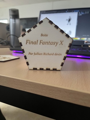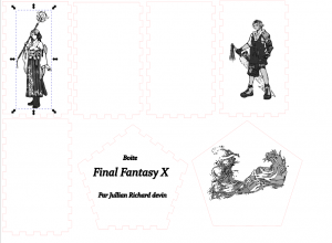 Maintenant que j'ai choisis les dessins à graver sur les faces des boites, il faut copier coller les dessins pour les mettre. J'ai choisis d'en mettre 3 pour ne pas que ça sois trop chargé. J'ai aussi décidé de mettre en dessous de la boite le titre "Boite Final Fantasy X" et mettre mon nom / prénom.