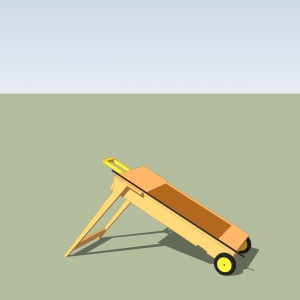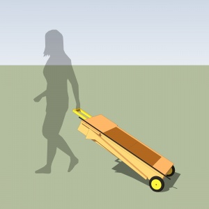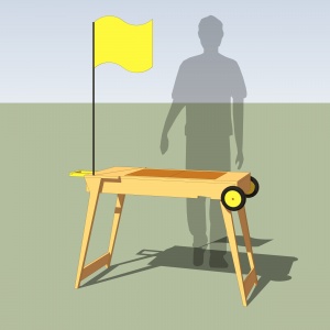 Le cahier des charges : - Le dispositif doit être léger (15kg max) et facilement transportable sur tout type de terrain (grandes roues, pognée ergonomique, dimensions adaptées). - Il doit aussi être facilement manipulable pour être déployé en configuration stand (minimum d'opération de montage, actions simples). - Il faut qu'il soit visible, qu'il se signale comme un lieu de convergence (signalétique, couleurs). - Il faut qu'il puisse contenir de quoi organiser les temps de convivialité ainsi que le matériel nécessaire aux ateliers à domicile (rangement, accessibilité). - La fabrication du dispositif doit pouvoir être assurée avec du matériel simple (soit cnc, soit petit électroportatif, si possible à partir d'un seul matériau).