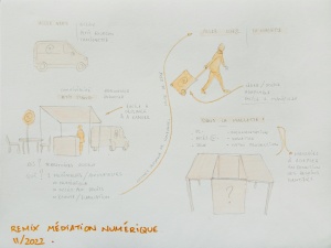 Un concept et un projet de déplacement sur le territoire à l'aide d'un véhicule de médiation numérique qui se rendra sur des marchés et manifestations régulières. L'idée est de proposer un café aux habitant.es et d'échanger autour du numérique. Une fois que le contact est établi proposer des ateliers de médiation numérique et/ou d'accès au droit. L'idée est également d'avoir à disposition dans le véhicule une mallette modulable de médiation numérique grâce à la quelle on peut aller proposer ces ateliers directement chez les habitant.es.