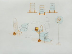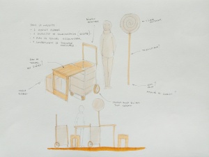 Première conception (esquisses 2 et 3) : Une structure type caddie permet d'accueillir des boîtes empilables. Un plateau escamotable est présent pour supporter les temps d'atelier ou matérialiser le stand.