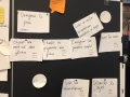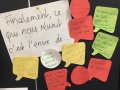 Trois groupes ont été accueillis par notre équipe. Une question leur a été posée en premier lieu à savoir ce qu'il voyait en premier dans cette salle. Ce qui a sauté aux yeux des participants c'est l'outil qu'on leur présentait. Notre outil leur fait penser à une ligne de métro, une cartographie, une frise chronologique, une carte électronique... Nous sommes satisfaits car nous nous sommes inspirés de ces différentes choses pour créer notre objet. Notre visuel a été compris