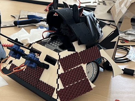 Une des difficultés a été de faire le coffre s'ouvrir, de même pour la visière, les moteurs n'étant pas assez puissants pour ce faire nous n'avons pas réussi.