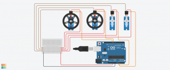 Adrien s'est occupé de faire tous les branchages en utilisant une breadboard pour brancher toutes les broches 5V et GND pour les 4 servomoteurs en plus de broches de signal directement sur la carte du mbot. Le schéma de câblage ci-dessous a été réaliser avec toutes ses idées en tête, la carte Arduino représente la carte du mBot.