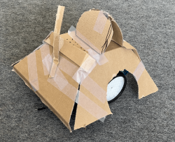 Nous avons ensuite créé une maquette en carton rapidement pour visualiser nos idées. Cette maquette n'est pas précise, mais est très utile pour nous donner un repère dans l'espace quand nous discutons des différents assemblages et de comment mettre en place certaines fonctions.