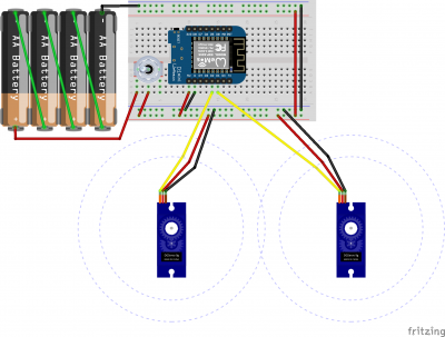 Il faut brancher les bornes positives des servos moteur aux bornes 3 et 4 du Wemos. Si la carte possède une borne imput brancher les piles directement sur l'input et la masse, si la carte ne possède que l'entrée micro-USB récupérer un embout de chargeur ou un adaptateur micro-USB et brancher les fils reliés aux fils (masse et borne positive) sur la fiche (voir internet au cas ou mais en général (-) à l'extérieur, (+) à l'intérieur de l'embout).