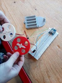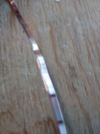 Insérer les bandes cuivrées dans les fentes comme la photo ci-dessous. Après l'impression du châssis et des roues. Coller les servos moteurs aux roues et les circuit au châssis. Utiliser de la colle pour coller les servos au châssis