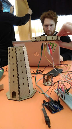 Nous avons fixé la LED à un petit bout de carton que nous avons placé à l'emplacement de l'optique du phare et nous avons utilisé les pinces crocodiles pour lier la lampe à la Breadboard qui se situe dans la base du phare avec la carte Arduino. Nous avons ensuite placé une feuille de calque enroulée à l'intérieure de l'optique du phare, autours de la LED RGB.
