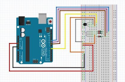 On utilise un Breadboard, un capteur thermique, une LED RGB, des pinces crocodiles, des résistances 220 Ω, ainsi que des fils. Nous réalisons le montage ci-dessous.