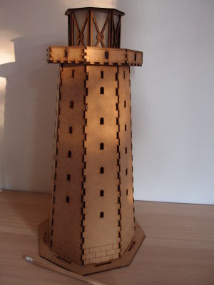 Nous avons trouvez sur le site Thingiverse des plans pour un phare que nous avons ensuite utilisé puis fabriqué à la découpe laser. Les plans que nous avions trouvé en premier lieux sont trouvables ici. Cependant, nous avons modifié les plans de base pour qu'ils conviennent à notre projet. Vous pourrez trouver ces plans ci-dessous.Notez qu'une des faces du phare contient une porte que nous avons réalisé nous même pour pouvoir faire passer le câble d'alimentation de la carte Arduino. Le phare seul, sans les éléments numériques que nous lui rajoutons, ressemble initialement à cela :