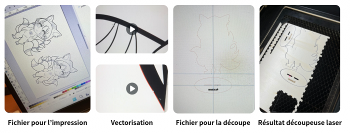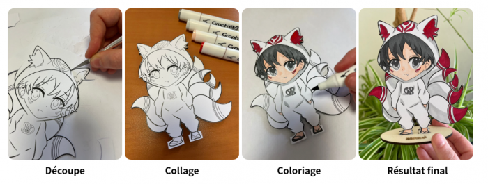Réalisation : Pour la figurine, j’ai réalisé le dessin sur Procreate en faisant un croquis, sur un autre calque j’ai fait le line, puis chaque couleur sur des calques différents également. J’ai importé le calque du line dans Inkscape pour le vectoriser et le dupliquer sur une page pour l’impression. Sur Inkscape toujours, j’ai réalisé les contours du personnage pour la découpe, j’ai également fait un socle en reprenant les caractéristiques de la figurine originale de la marque. J’ai fait l’impression sur du papier polypropylène (ce qui m'a semblé le mieux comme surface pour les feutres à alcool) dans une imprimerie et j’ai fait la découpe de la figurine à la découpeuse laser en utilisant Xtool. Pour la découpe, j’ai utilisé du bois « Baswood » d’épaisseur 3mm. Les réglages étaient de mettre la puissance à 100 et la vitesse à 3, pour la gravure c’est selon ce que l’on souhaite, les indications sont directement sur le logiciel. Une fois que j’ai tout les éléments, j’ai collé les deux faces de la figurine que j’avais préalablement découpé. J’ai ensuite fait le coloriage d’une face avec les feutres à alcool.