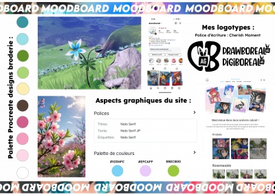 Il s’agit d’un ensemble de mini projets dans un seul et grand projet qui est l’amélioration de ma boutique de dessin DRAWBOREAL. J’ai fait la réalisation de stickers et de la broderie sur des tote bags déjà préparés. Suite à un partenariat, la marque de feutre Graph'It a lancé un concours, j’ai donc réalisé ma propre figurine. Coté communication, j'ai pu revoir le logo.